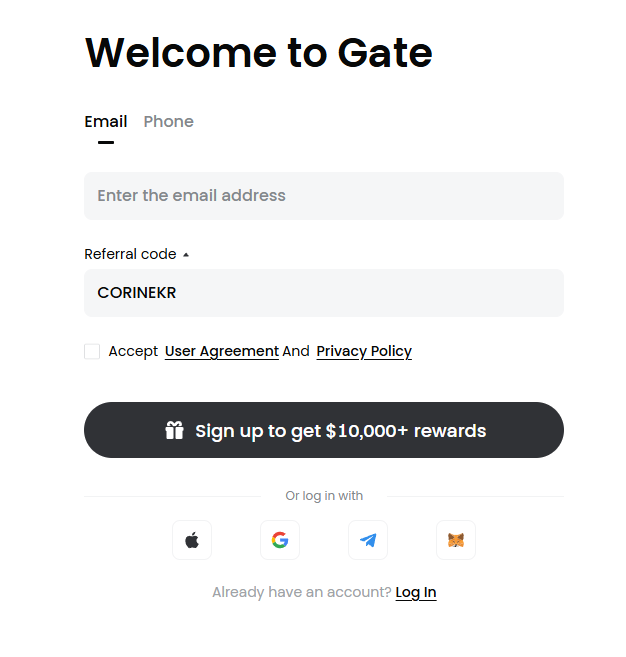 사용할 이메일을 입력하시고 Referral Code (Optional) 을 클릭하여 레퍼럴 입력란을 열어 CORINEKR 코드를 입력해주세요