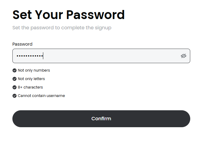 마지막으로 비밀번호를 설정하신 다음 Confirm 을 누르시면 가입이 완료됩니다